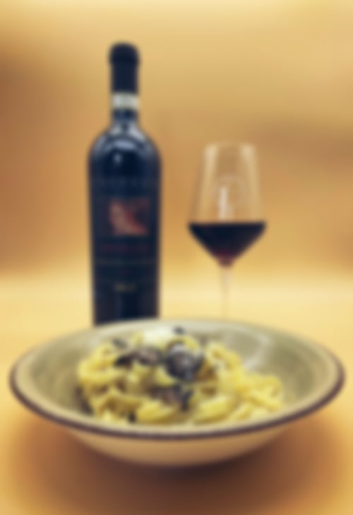 Dieser reichhaltige Rotwein mit Aromen von dunklen Früchten und Gewürzen ergänzt perfekt die cremigen Tagliatelle al tartufo.