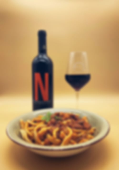 „Hausgemachte Casarecce-Pasta, kombiniert mit Borlotti-Bohnen, Pancetta und einer rustikalen Kirsch-Tomatensauce. Dazu passt ein junger, fruchtiger Rotwein, hergestellt nach der Kohlensäuremaischung-Methode, der mit intensiven Noten von roten Früchten und einem frischen Charakter die herzhaften Aromen des Gerichts harmonisch ergänzt.“